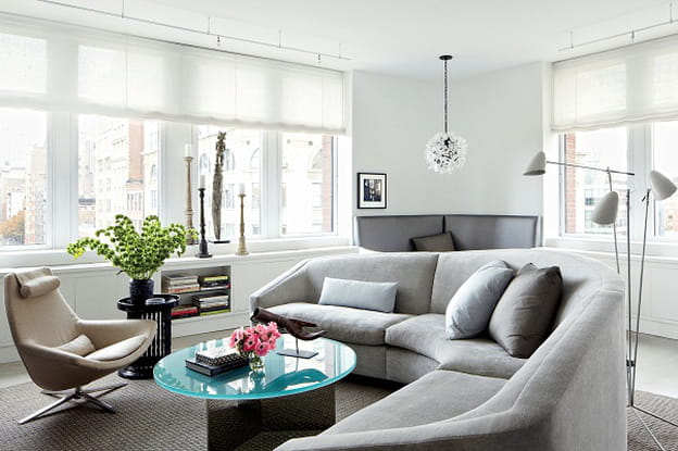 غرفة معيشة النجم ويل فاريل في منزله بنيويورك والتي غلب عليها الطابع المودرن مع الألوان الحيادية وقطع الأثاث القليلة التي منحت الغرفة مزيد من المساحة والإضاءة، تم تجديد الغرفة من قبل المهندس Richard Perry ومصمم الديكور Shawn Henderson.